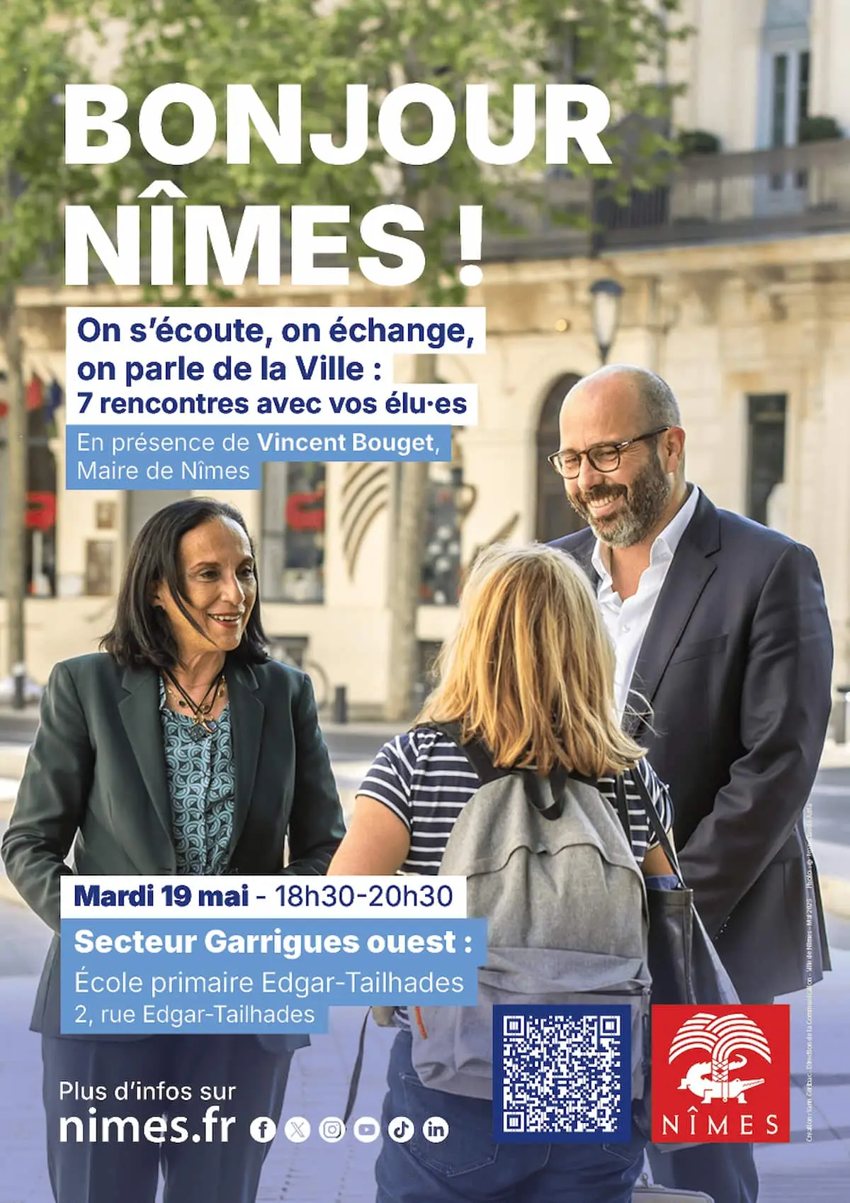 Participez à “Bonjour Nîmes”, une série de sept rencontres avec le maire et les élu.es de quartier pour vous écouter et co-construire la ville ensemble. Rendez-vous le mardi 19 mai à 18h30. Prenez date pour échanger.