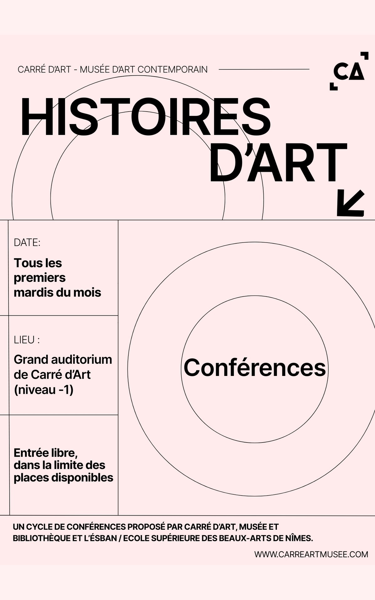 Des conférences dédiées à l'"Histoires d'Art" en lien avec les collections de Carré d'Art - musée d'art contemporain sur la photographie, les arts plastiques, et l'Arte povera.