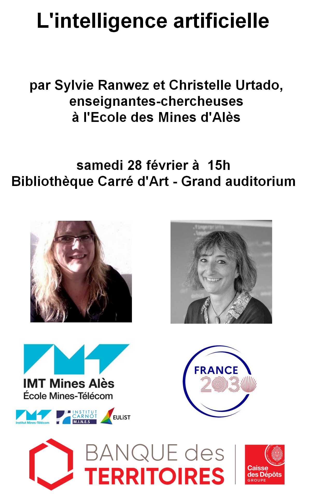L’Institut Mines Télécom d’Alès et Carré d’Art s’associent pour proposer un après-midi exceptionnel de découverte des enjeux liés au dialogue homme-machine : de l’algorithmique classique aux avancées récentes de l’IA. Une conférence et des ateliers vous permettront de mettre en pratique les concepts présentés en compagnie de petits robots pédagogiques.