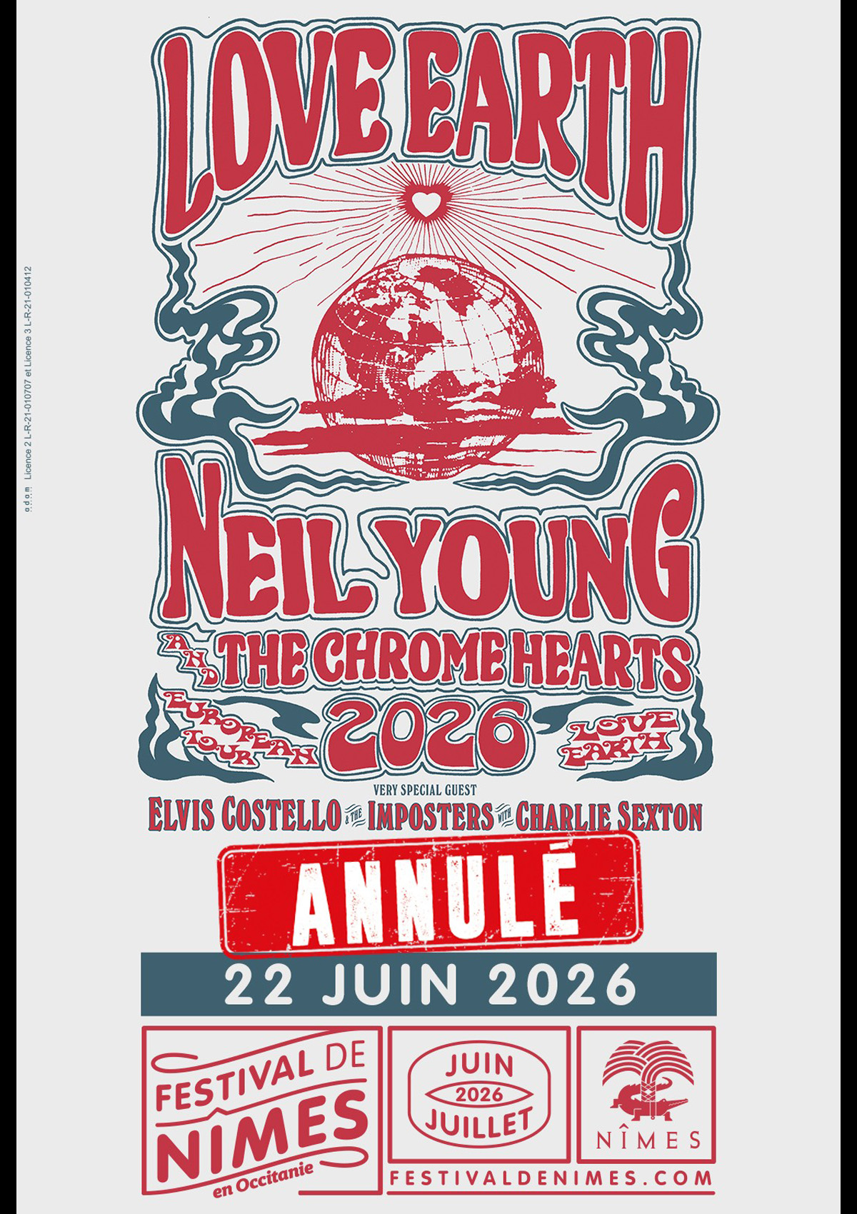 Nous vous informons que, suite à la décision de l’artiste, le concert de Neil Young & The Chrome Hearts initialement prévu au Festival de Nîmes, ainsi que l'ensemble des dates européennes, sont annulés.