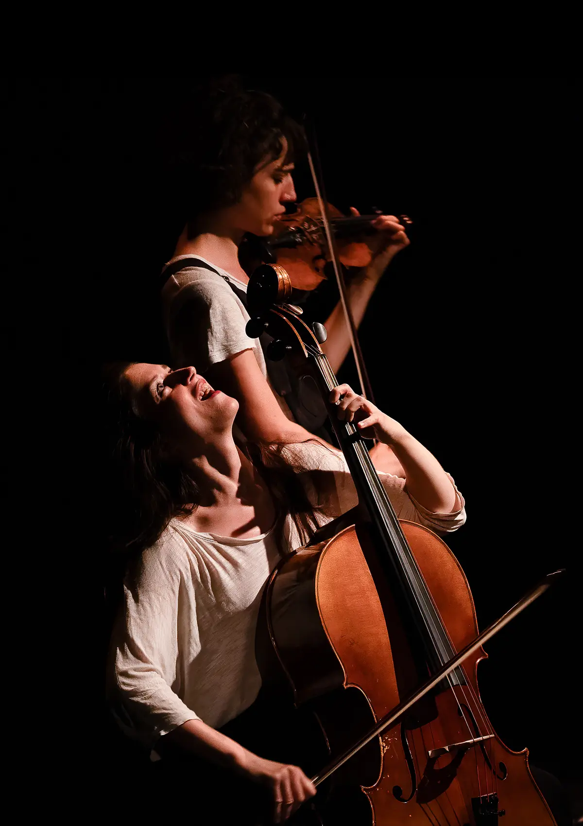 Un violon, un violoncelle. Deux jeunes femmes, deux voix, deux instruments. Elles sont musiciennes, ont grandi avec, dans et pour la musique. Elles se racontent, rejouent leur naissance à la musique, leurs premières émotions sonores, écartelées entre deux pôles : d’un côté, la joie infinie de toucher du doigt l’harmonie absolue, et de l’autre, les dégâts causés par cette enfance et cette adolescence à côté du monde.