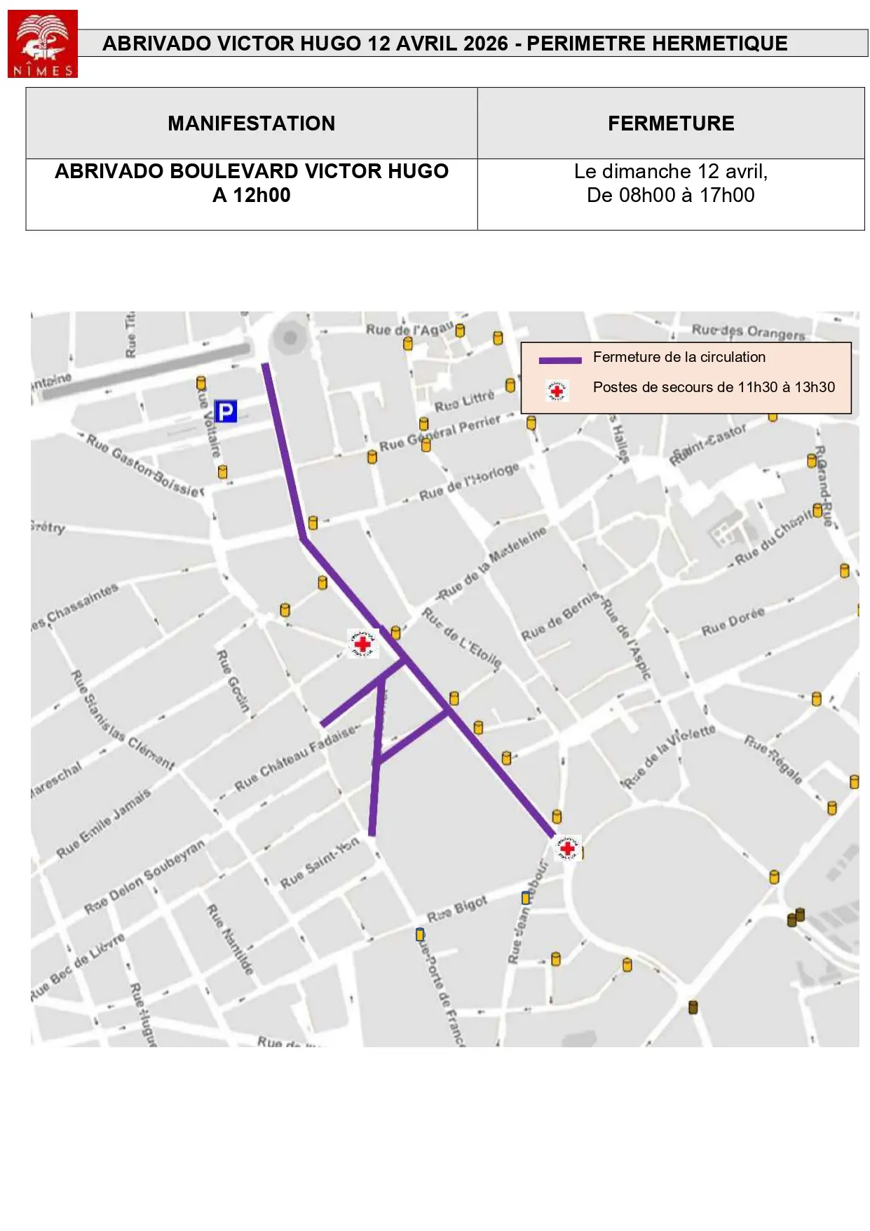 Retrouvez ci-dessous le plan de fermeture de la circulation pour l'abrivado prévu sur le boulevard Victor-Hugo qui se déroulera le dimanche 12 avril 2026.