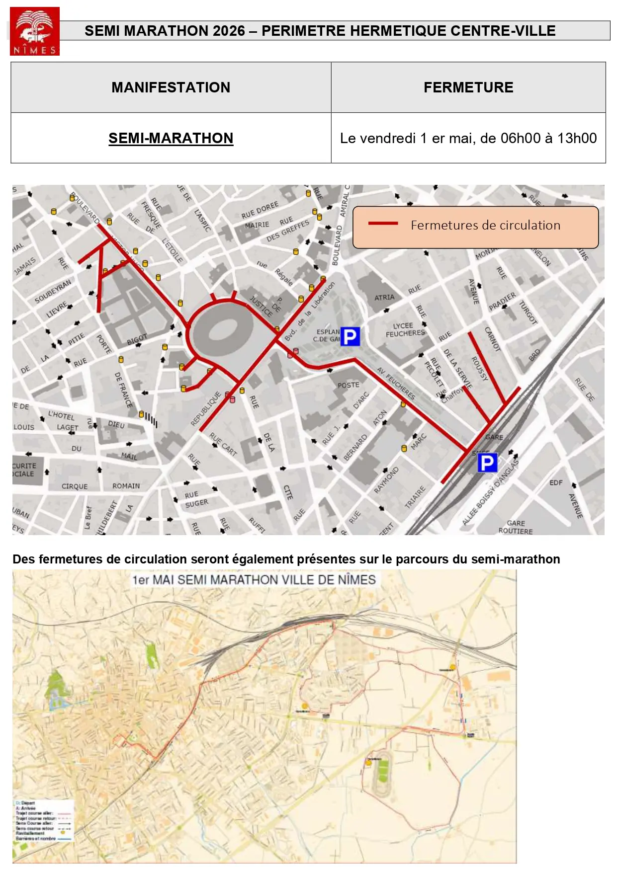 Retrouvez ci-dessous le plan de fermeture de la circulation pour le semi-marathon de Nîmes prévu le 1er mai 2026.