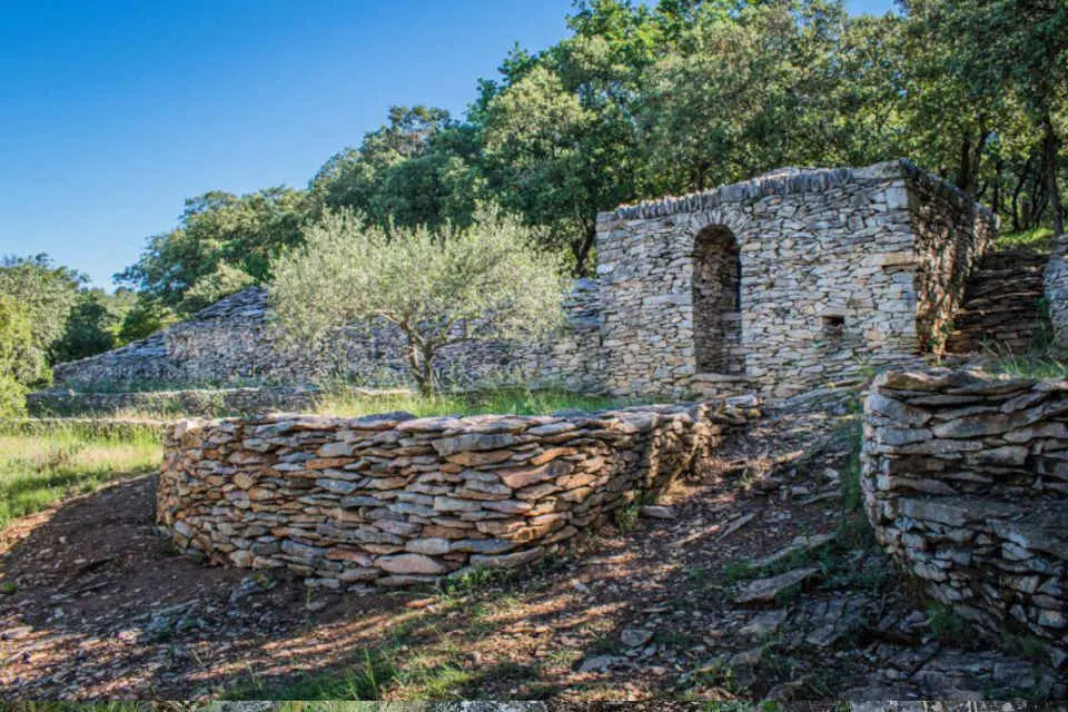 Des bâtis en « pierre sèche » et des bassins ont été conservés. De nombreuses parcelles sont délimitées par des murs de pierres sèches (clapas) effectués par des générations de cultivateurs et de bergers. L’édification de ces terrasses sur les versants des collines permettait de rendre le terrain cultivable. On retrouve ce type de construction traditionnelle dans toutes les collines de la région nîmoise.