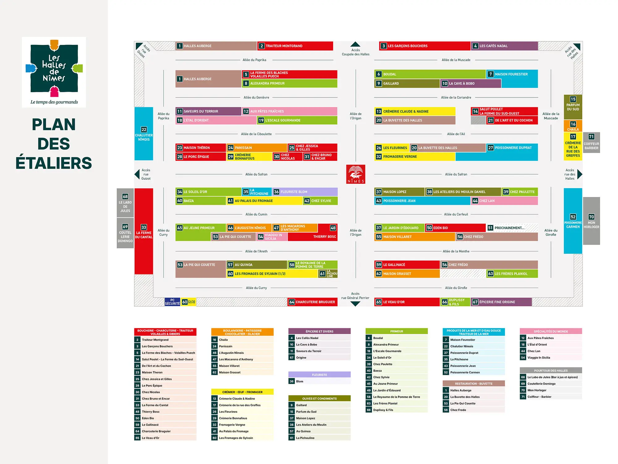 Le plan des étaliers vous aide à explorer les Halles de Nîmes en un coup d’œil. Localisez chaque stand, retrouvez vos commerçants habituels ou laissez-vous guider vers de nouvelles saveurs : un outil simple pour vivre pleinement l’ambiance des Halles.