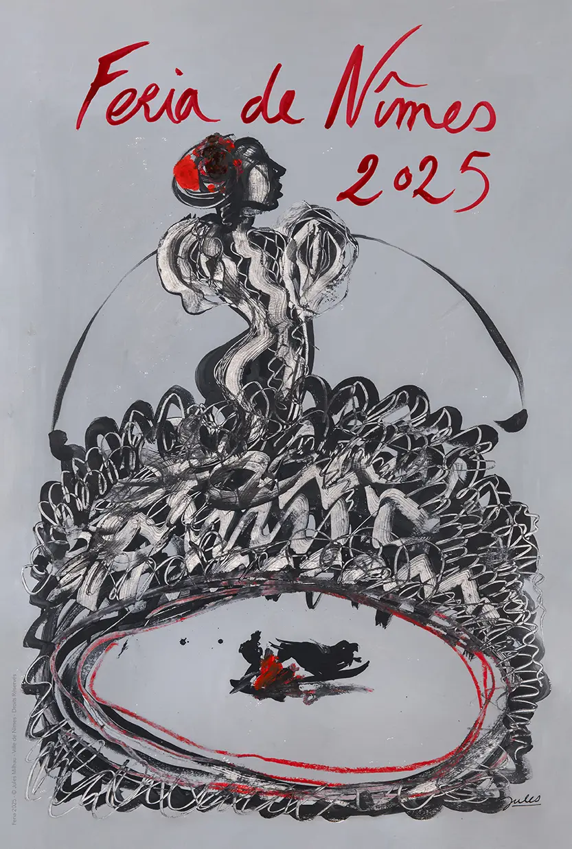 En 2025, la Ville joue la carte de la jeunesse en confiant au Nîmois Jules Milhau, 24 ans, la réalisation de l’affiche des prochaines Feria. Son œuvre, une peinture à l’huile, représente une danseuse flamenca de profil surplombant une arène, ainsi qu’un torero y réalisant une passe.